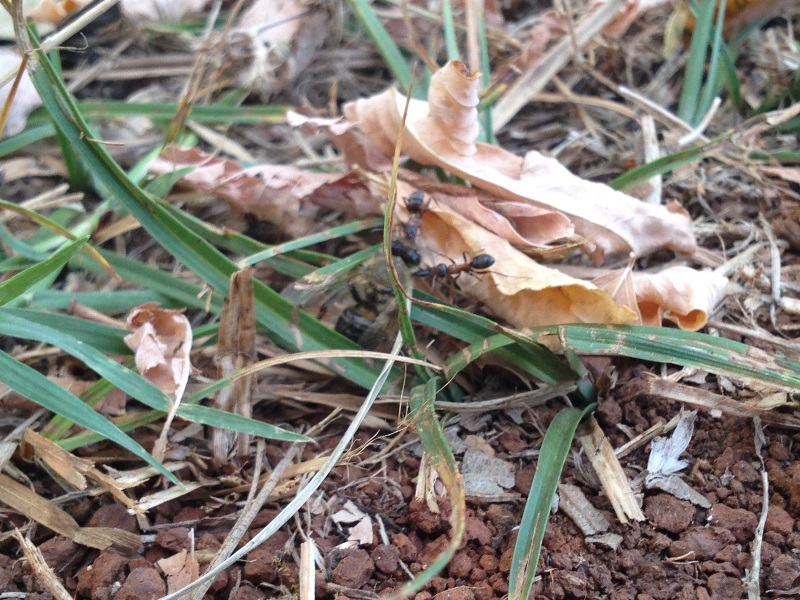 Von ner Biene gestochen, sehen wie die(?) tote Biene von zwei Ameisen über 5 Meter weggetragen wird.