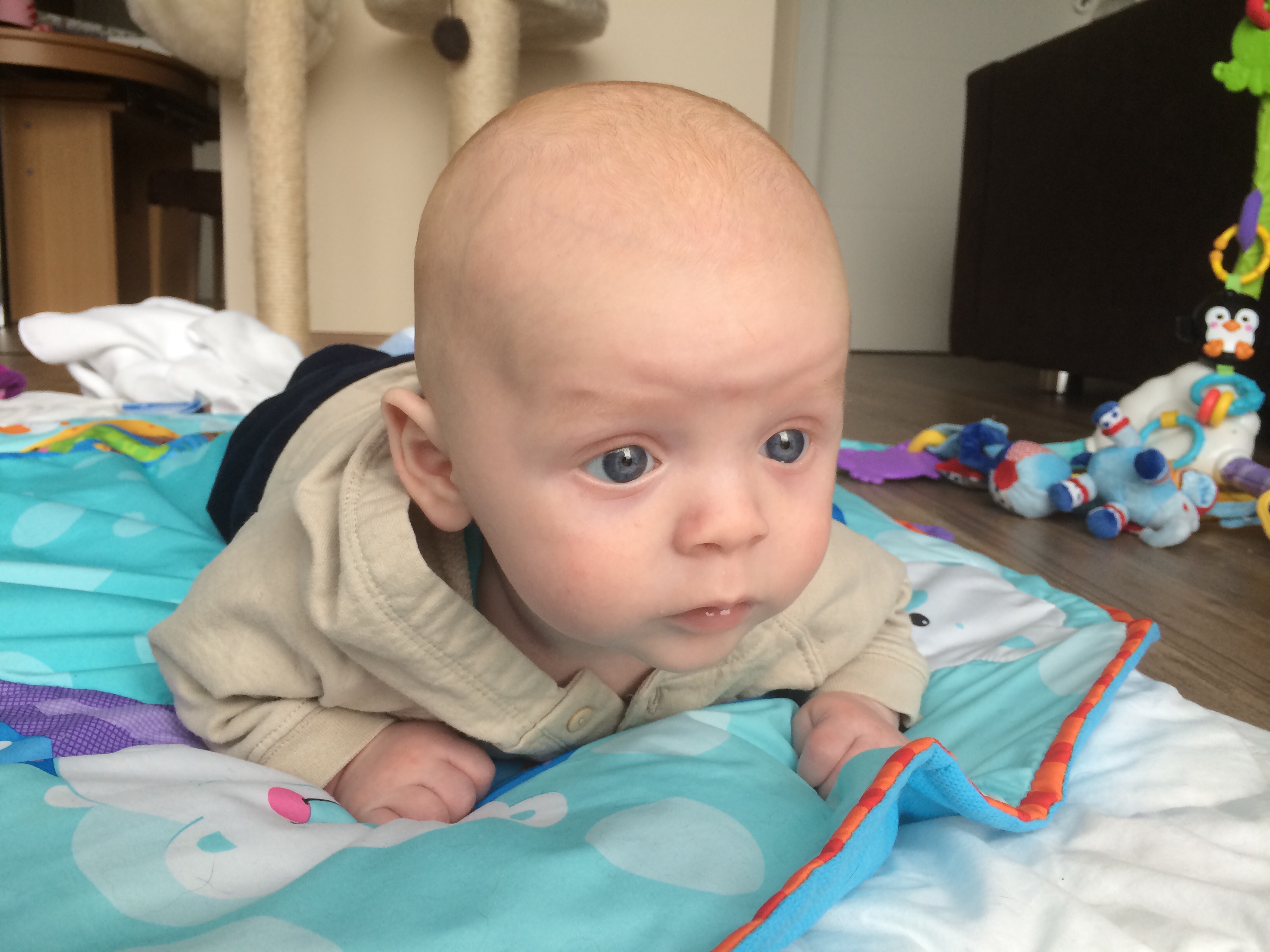 Enti kann schon super den Kopf selbst halten, wir trainieren auch brav die Muskulatur damit er bald sitzen kann. Hochstuhl ist auch schon gekauft.